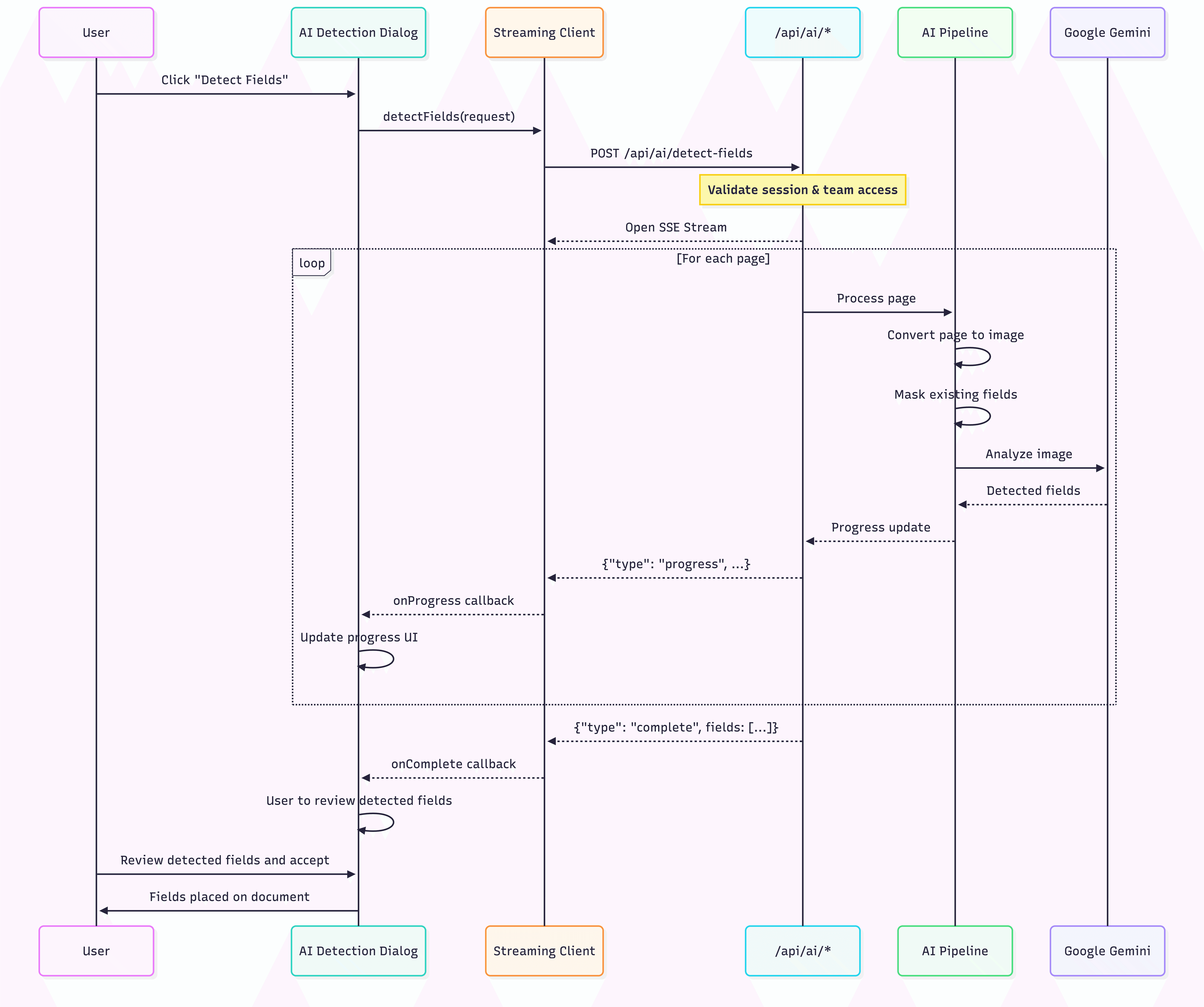 The sequence diagram below shows the complete end-to-end flow, starting from the user’s click in the UI, through the streaming API layer, into the page processing pipeline that converts pages to images and masks existing fields, and finally to the Gemini analysis step that produces detected field objects. It also highlights the feedback loop: progress events are pushed back as NDJSON so the UI can continuously update status while the pipeline runs, and the final result is returned as a structured list of fields ready to render and accept.